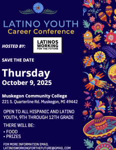 Latinos Working for the Future, in partnership with Muskegon Community College is hosting a Latino Youth Career Conference! Students will hear first hand and learn from career professionals about the different opportunities and paths for life after high school.